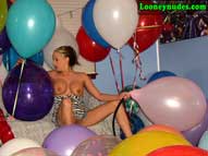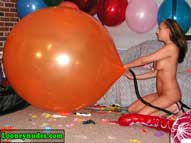 Returning home from school to study, Sarah tries her best to concentrate, but the balloons constantly taunt her to drop her books and play. Surrounded by the tightly inflated helium and air-filled balloons, Sarah can no longer resist. She drops the books and begins her attack. She tries to teach the balloons a lesson by overinflating one of them until it explodes in the hope that it will make the other balloons behave. Some further sitting by her tight butt and squeezing with her sharp nails still doen't teach the balloon to behave. Sarah takes the next step and removes her dress to expose her beautiful breasts. This seems to calm the balloons more, but alas it is just a tease. With her clothes removed, Sarah feels naughty and begins her discipline. Letting her hair down she puts a balloon to her lips and slowly tortures it until one more hot blow of air makes it explode. After the loud bang, more overinflation, sitting, stomping and squeezing takes place. After a quick break, Sarah begins to tease the balloons again with her gorgeous body by rubbing the balloons all over her. If only the balloons had been good to her in the beginning. Instead, now they must all be popped. Sarah's highheels become deadly weapons, her lips and cheeks cause devastation. Her nails become razors and her butt a crushing device. When it is all done, the only thing left for Sarah to do is cover her body with the broken shards. Be sure to click on the film reel below for some sample clips from the video.